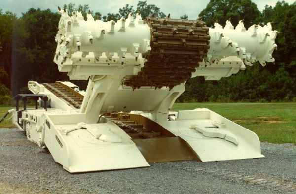 ![]() This is an underground coal miner. It can fit in a 42 inch seam. For thicker seams, the milling head moves up and down as required. Gathering arms on the front pad move the coal to the conveyor where it is picked up by a shuttle car. Fairfield designed and manufactured all seven drives in this machine. |